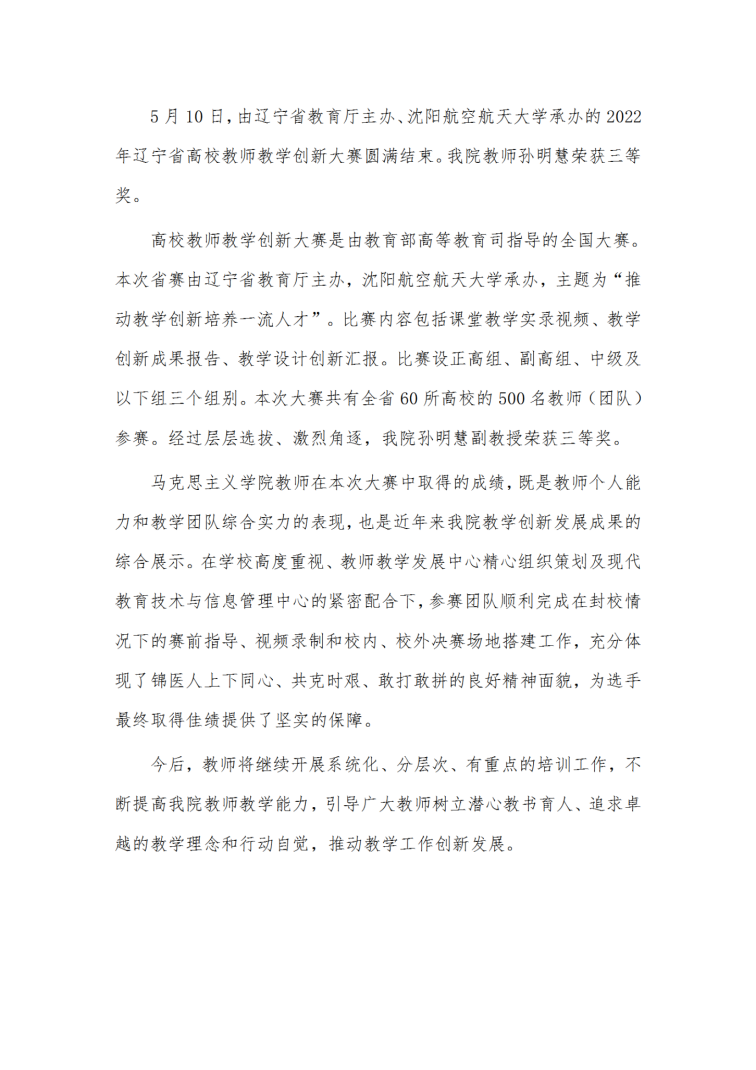 喜报!BB贝博艾弗森官网孙明慧在辽宁省第二届高校教师教学创新大赛中获得三等奖